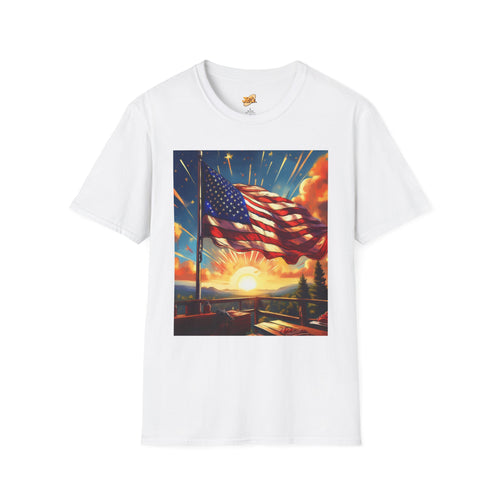 This lightweight cotton tee carries a bold, sunrise-and-flag illustration that feels both nostalgic and hopeful. The print captures a warm, painterly dawn behind a waving American flag, with dynamic rays and saturated color that stand out on the clean white canvas of the shirt. Wear it on weekend drives, community gatherings, or early-morning walks when the light feels like new possibility. The shirt’s soft hand and classic crew cut let the artwork do the talking while staying comfortable from sunrise through the day.
